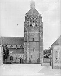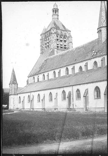 Eglise gothique sans transept, à trois nefs terminées par des absides polygonales. La grande nef compte sept travées voûtées en croisées d'ogives. La communication avec les bas-côtés est faite par de grandes arcades en arc brisé soutenues par de gros piliers polygonaux. Le bas-côté au sud comprend sept travées voûtées comme la nef. Celui du nord en a moins, la tour du clocher étant imbriquée à cet emplacement. L'abside et les absidioles sont voûtées sur de fines liernes et se divisent en sept pans. Une seconde flèche, en charpente octogonale, s'élève au-dessus de la seconde travée. Une petite tour polygonale, à la même hauteur, vient en saillie du mur gouttereau nord. Une autre tourelle existe au coin sud-ouest et est percée de meurtrières. La porte latérale nord est à gâble gothique. L'actuel édifice, oeuvre antérieure au 15e siècle, atteste, avec sa corniche à modillons, les caractères d'un édifice plus ancien, restauré après la guerre de Cent ans puis les guerres de Religion. La puissante tour du clocher, construite en 1494, avait servi à la défense. Elle était plus haute d'un tambour supportant une flèche de pierre, cantonné de quatre clochetons aux angles. Détruite en 1568, cette flèche fut rétablie en charpente de bois en 1572. Elle fut incendiée par la foudre en 1738. Les quatre clochetons furent supprimés en 1841.