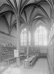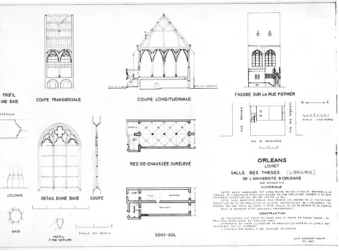 Cette salle, seul vestige de l'ancienne université d'Orléans, était en fait la librairie (bibliothèque). Elle a été construite entre 1411 et 1417. Le décor a été très restauré au 19e siècle.