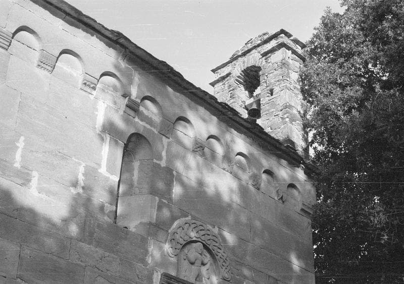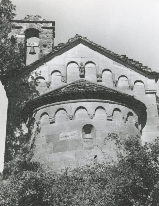 Chapelle romane rectangulaire avec abside semi-circulaire voûtée en cul de four. Linteaux, tymapns et archivoltes sculptés (Adam et Eve...) de manière archaïque. Datée du 13e siècle, la chapelle a probablement été remaniée vers 1453-1496. A l'intérieur, fresques du 15e siècle dans le cul de four et sur l'arc triomphal.