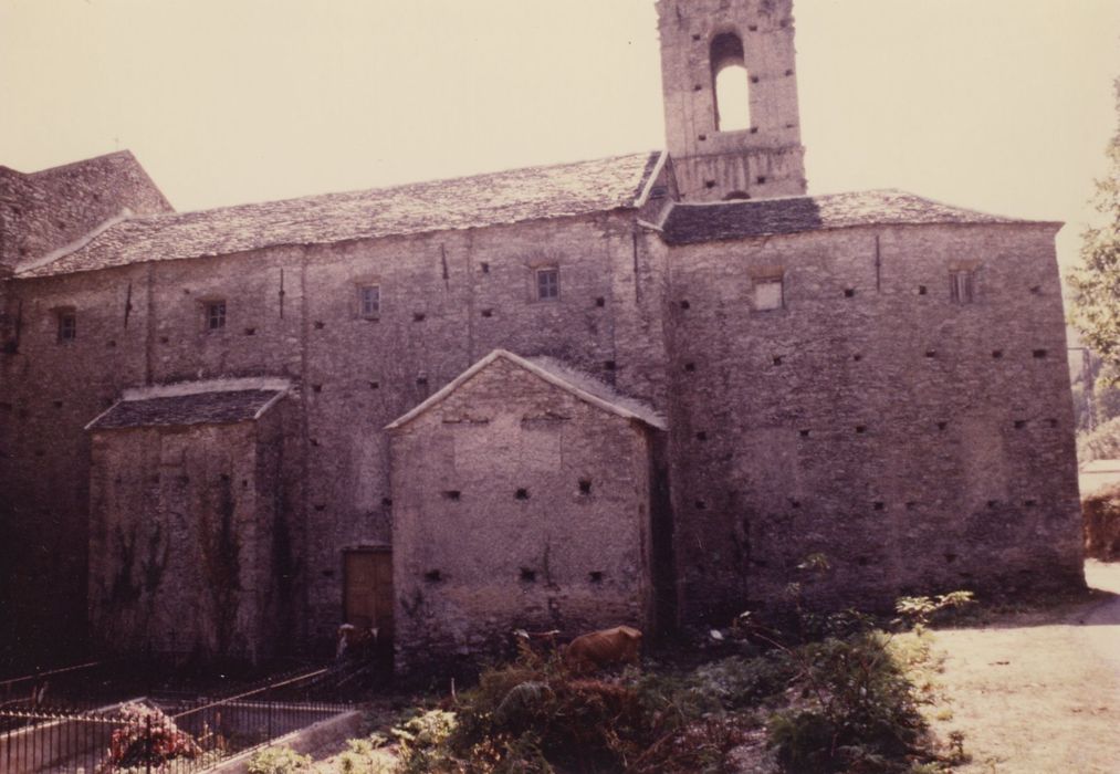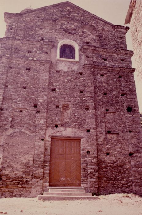 Eglise de la seconde moitié du 17e siècle, formant un ensemble avec le cimetière et la chapelle de Pénitents située à l'est. L'édifice, occidenté, a un plan à nef unique, flanquée de quatre chapelles prises dans les contreforts. La nef est couverte d'une voûte en berceau à pénétrations, reposant sur un entablement à ressauts, supporté par des pilastres à dosserets. Le choeur allongé comporte une travée droite et une abside à pans coupés. La construction est en moëllons, y compris le clocher à six niveaux, percé d'arcades, accolé à la travée droite du choeur, côté sud. La chapelle de Pénitents renferme un retable en gypserie dont les colonnes torses jumelées sont supportées par des Atlantes.