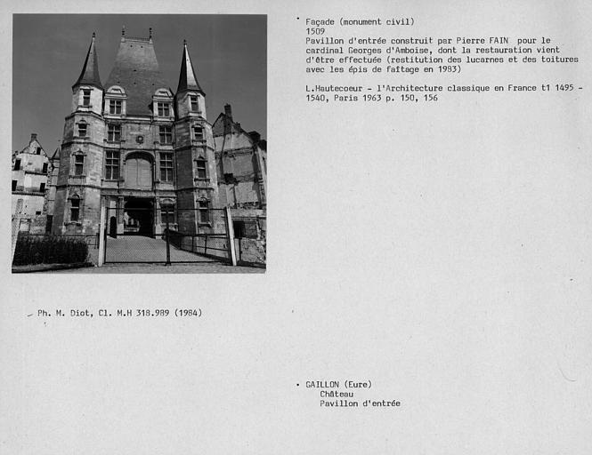 "Château : 18 04 1914 (J.O.). La propriété de l'Etat est limitée par rapport au domaine (château et anciens jardins) ; les parties classées appartiennent également à la commune et les parties inscrites appartiennent soit aux communes de Gaillon ou Aubevoye, soit à des propriétaires privés.
