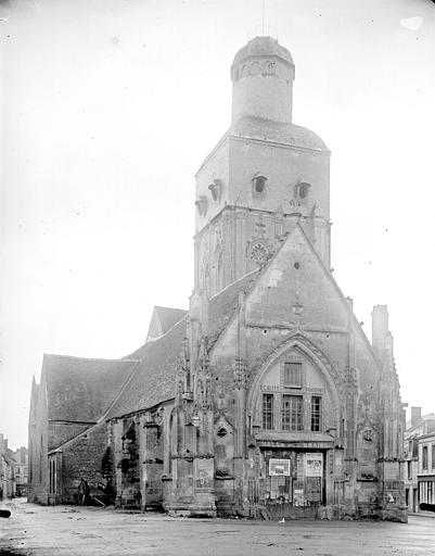 Eglise endommagée par faits de guerre, rayée de la liste des MH classés le 07 01 1952 (arrêté) , sauf clocher et mur occidental.