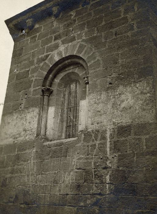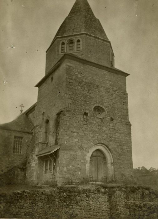 Eglise de la fin du 12e siècle, comprenant une nef à laquelle fut ajoutée postérieurement une chapelle de chaque côté du choeur voûté en berceau. La nef a été très remaniée. Le portail d'entrée est du 13e siècle et supporte un clocher volumineux du 12e siècle dont l'étage octogone et la flèche (18e siècle) sont constitués par une charpente habillée d'ardoises. Quatre faces de l'octogone sont ajourées par des baies à trois divisions encadrées de zinc. L'abside est à cinq pans. Les colonnes de l'arc triomphal ont conservé leurs chapiteaux sculptés. Corniches à modillons historiés.