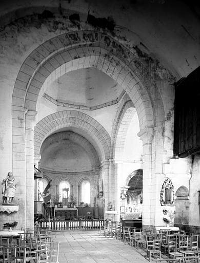Eglise romane avec transept à absidioles, clocher carré sur coupole. Abside à pans coupés dont les angles sont ornés de colonnettes à chapiteaux.