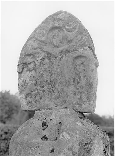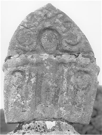 Croix (mérovingienne ?) constituée d'un bloc de pierre épais, semi losangique, au centre duquel est gravée en fort relief la silhouette du Christ en croix.