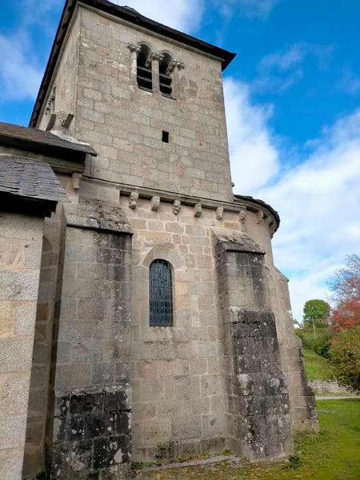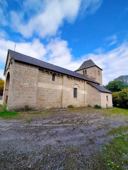 Eglise présentant un caractère assez nettement auvergnat. Proche de la grande voie transversale Clermont-Toulouse-Bordeaux, l'architecture de cette église a reçu les influences méridionales et auvergnates. Le sanctuaire se compose d'une nef unique, d'un choeur et d'une abside semi circulaire voûtée en cul de four. Un arc triomphal plein cintre à double rouleau sépare la travée précédente de l'abside. Cet arc repose sur des colonnes aux chapiteaux décorés d'animaux fantastiques. Portail polylobé appareillé que protège un porche massif et profond. L'édifice est roman, probablement du 12e siècle. La baie axiale que surmonte un larmier semble dater du gothique tardif. De plan barlong et de proportions massives, le clocher à un étage est percé d'arcatures géminées avec de curieux chapiteaux. Les chapelles latérales sont des additions modernes.