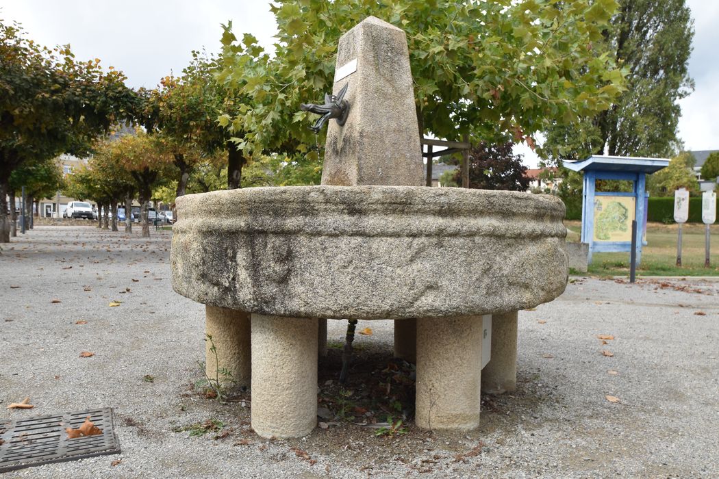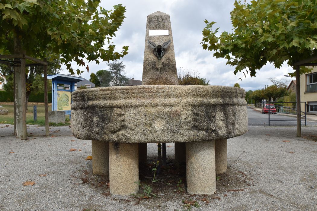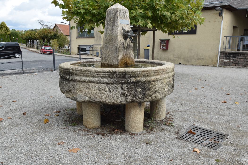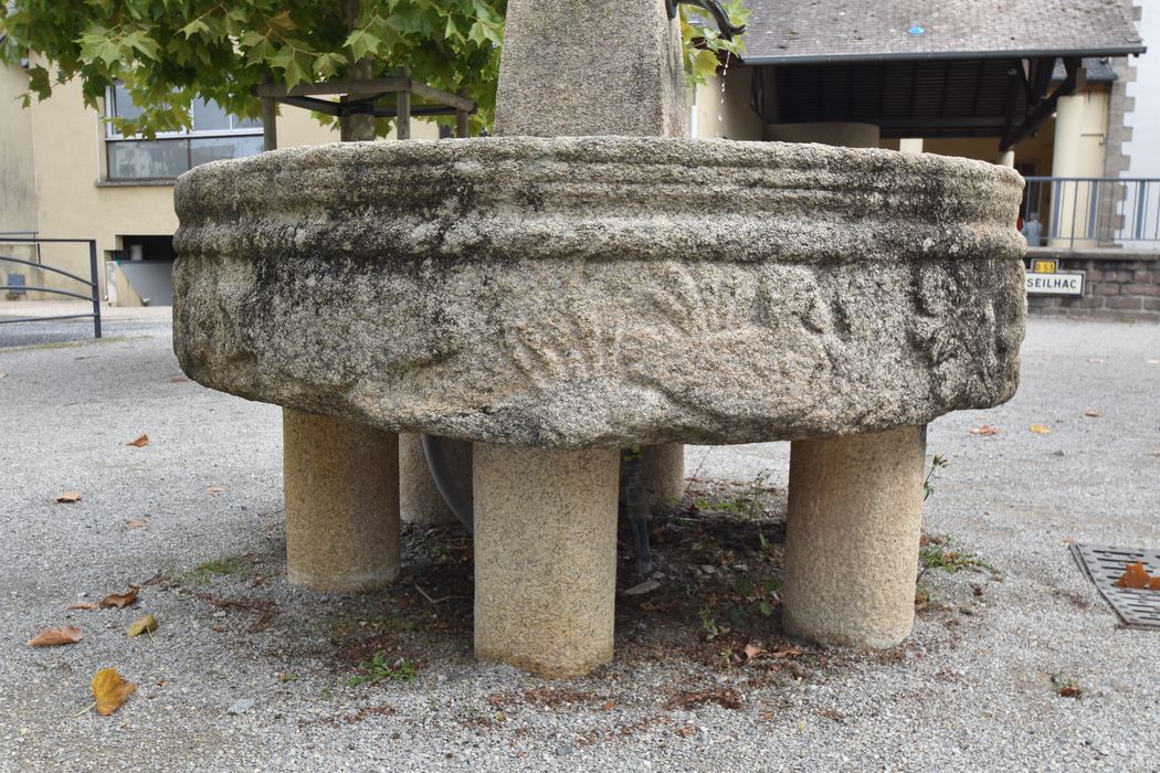 Fontaine composée d'une cuve en granit du 14e siècle, couverte de sculptures en méplat qui paraissent représenter les signes du zodiaque entre deux torsades. La pyramide centrale a dû être ajoutée au 18e siècle.