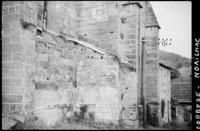 L'église possède une abside du 12e siècle, polygonale à l'extérieur et circulaire à l'intérieur, ornée de colonnettes aux chapiteaux sculptés, et éclairée par cinq fenêtres dont trois larges et deux étroites. La travée du choeur est également ornée de quatre demi-colonnes aux chapiteaux ornés de personnages. Le transept et les quatre travées de la nef sont du 15e siècle, avec voûtes d'arêtes nervées et clefs armoriées. Le portail est de la même époque. Au-dessus, existaient deux étages de tribunes, éclairées par des fenêtres du 16e siècle, et surmontées d'une toiture à pignon avec tourelle en échauguette. Cette disposition rare vient de ce que l'église était autrefois englobée, sur ses faces nord et ouest, par un château appartenant à la famille de Noailles. L'édifice a été démoli à la fin du 19e siècle. L'échauguette, desservie par un chemin de ronde, défendait l'angle sud-est de ce château. Le clocher porte deux créneaux sur chacune de ses faces et l'abside, également fortifiée, conserve sur son pourtour les consoles qui portaient les mâchicoulis.