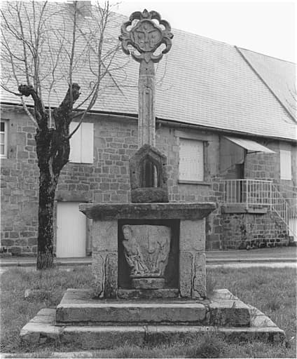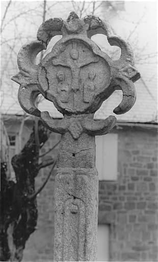 Croix en granit placée sur un socle rectangulaire, lui-même supporté par un escalier à trois marches qui n'entoure pas la face antérieure du socle. La partie supérieure est en forme de médaillon losangé entouré de festons circulaires. Ce médaillon porte, en son centre, en léger relief, un Christ en croix ayant les Saintes femmes debout à ses pieds. Dans le socle, en façade, est encastré un chapiteau représentant le Christ assis, une main sur la poitrine, l'autre posée sur le genou. Derrière lui, à sa droite, un personnage tient un encensoir. A droite du chapiteau, très fruste, un animal dont on ne voit qu'une jambe terminé par un pied portant des griffes et une aile. Au milieu de cette aile se trouve une demi sphère. Entre le Christ et l'aile est gravée une inscription.
