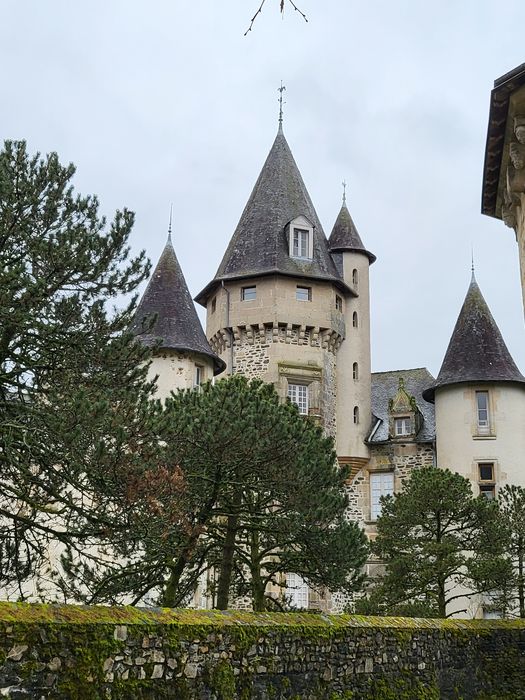 Une châtellenie existait dès le début du 12e siècle. La tour a dû être bâtie fin 13e début 14e siècle. Pendant les guerres de Religion, en 1586, le château fut démoli puis reconstruit. Pendant la Révolution, le château fut dévasté en 1792, puis exploité comme carrière de pierres. Si le rez-de-chaussée conserve des structures médiévales et la tour sud une coupole médiévale, les autres parties du château furent rhabillées au début du 19e siècle dans un style d'inspiration Renaissance pour la façade sud-ouest et 19e siècle pour la façade sud-est. La tour est polygonale avec des ouvertures Renaissance. La porte est cantonnée de pilastres avec chapiteaux et corniches moulurés. Au-dessus de la corniche, sont sculptés des chapiteaux ornés de volutes. Le chemin de ronde et les mâchicoulis ne sont pas d'origine. Prenant appui sur le mur à l'ouest de la tour se trouve une tourelle en échauguette abritant un escalier à vis qui menait à l'ancien chemin de ronde. La tour sud est voûtée, au rez-de-chaussée, d'une coupole médiévale. L'escalier à double révolution a été bâti après la Première guerre mondiale.