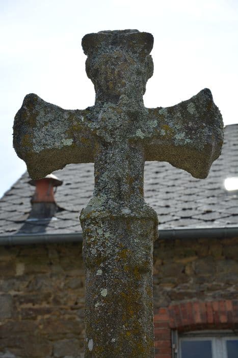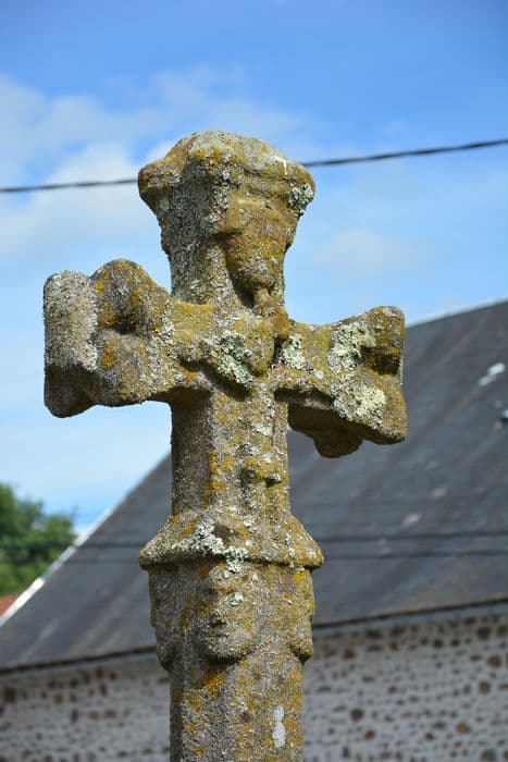 Croix en granit sculptée sur les deux faces du même motif : le Christ en croix. Au-dessus, une tête vue de face touche au couronnement de la croix (Dieu le Père ?). Entre cette tête et celle du Christ, une figuration grossière paraît être un oiseau (colombe du Saint-Esprit ?). L'ensemble de la sculpture pourrait ainsi représenter la Trinité.