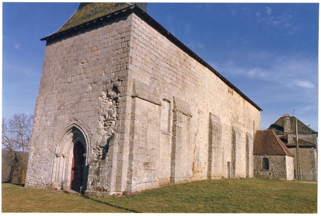 Chamberaud était une commanderie de l'ordre de Malte. Les Templiers y avaient eu un établissement dont la chapelle, en 1282, dépendait de l'église de Frauséches. Cette chapelle, devenue église paroissiale, était attenante aux bâtiments de la commanderie. Pendant la guerre de Cent ans, l'édifice a été surélevé et fortifié. Le plan se compose d'une nef à chevet droit précédée d'un porche supportant le clocher. La première travée forme choeur. La façade occidentale est percée d'un portail au cintre brisé, à double voussure avec colonnettes, refait à l'époque moderne. La façade sud conserve des restes de mâchicoulis. Une porte dont le linteau est orné d'un arc en accolade et d'une croix de Malte, donne accès à une salle voûtée, en contrebas, sous le porche. A l'intérieur, la nef est couverte de voûtes d'ogives à liernes en bois, imitant peut-être les anciennes voûtes en pierre écroulées.