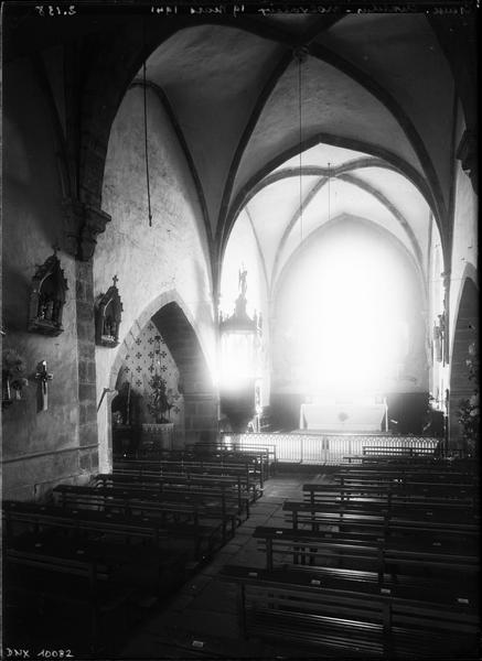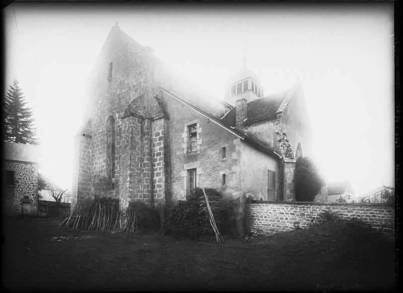 Le patronage de cette église appartenait à l'abbaye de Chambon. L'édifice est formé d'une nef de trois travées voûtées d'ogives, précédées, à l'ouest, d'une travée très courte voûtée d'un berceau brisé dont la retombée se fait sur un cordon en quart de rond. Chapiteaux sculptés. Deux chapelles latérales ouvrent par des arcs brisés, l'une au sud, l'autre au nord de la travée précédant le choeur. La chapelle sud s'ouvre par une porte en tracé brisé avec tympan orné d'un écu. La baie du chevet est surmontée d'une ouverture pour arriver à un chemin de ronde, seul vestige des fortifications. L'accès aux toitures et au clocher se fait par un escalier à vis enfermé dans une tourelle rectangulaire accolée au côté nord, dans l'angle formé par la chapelle latérale.