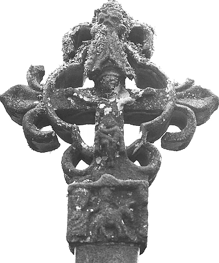 Cette croix a été transférée de l'ancien cimetière, qui se trouvait à proximité sud de l'église, dans le cimetière actuel aménagé à l'écart du bourg. Le soubassement est formé de trois gradins en retrait, superposés. Sur le gradin supérieur est posé sur un socle cubique d'où s'élève le fût octogonal, cubique à ses extrémités. Au-dessus du noeud qui la sépare du fût, la croix comporte une base cubique dont trois des faces sont ornées de sculptures représentant des personnages et des animaux, scènes de l'enfance du Christ. Au-dessus de cette base historiée, la croix présente, sur la face sud, un Christ crucifié surmonté d'un dais flamboyant (accolade sous un gâble à crochets). Sur la face opposée, la Vierge à l'Enfant. Ces personnages sont présentés dans le cadre d'un quatrelobe ajouré joignant montants et bras que terminent des fleurs de lys dont les volutes de la corolle se détachent de part et d'autre du pistil.