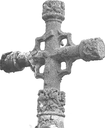La croix est placée sur un socle cubique terminé par une table carrée aux bords saillants chanfreinés. Sur cette table est posé un socle cubique, en forme de tronc de pyramide dans sa partie supérieure. Sur la plateforme terminale de ce socle est posé le fût circulaire, au-dessus d'une base carrée. Un noeud sépare le fût de la croix. A la base de ce noeud fait saillie une baguette torique. Au-desus règne un décor de feuilles frisées et retournées. Bras et montant ont leurs extrémités également cylindriques, renflées au-dessus d'un tore. Deux de ces cylindres terminaux ont un décor végétal. Bras et montant sont réunis autour du centre de la croix par des redents, formant un nimbe sensiblement carré, ajouré de quatre lobes. Sur une face est représenté le Christ crucifié ; sur la face opposée, la Vierge tenant l'Enfant est représentée debout sur une console prismatique, la tête abritée sous un gâble décoré d'un trèfle.