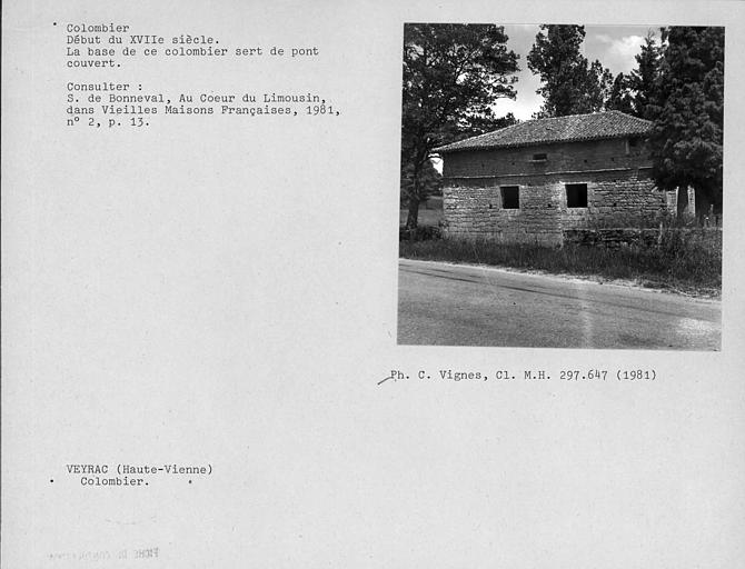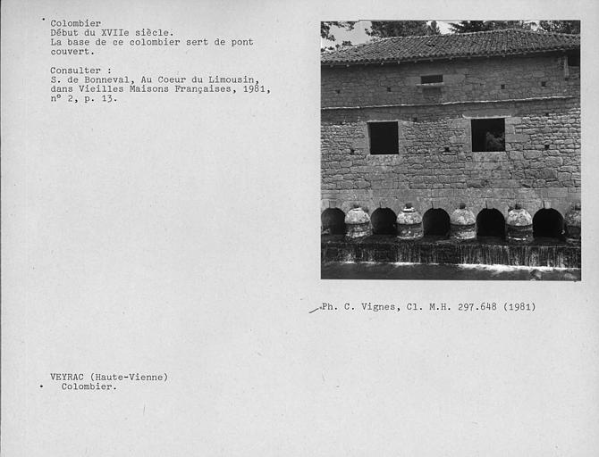 Ce colombier fut probablement construit par Jean de Londeix, sieur de la Puytignon, qui acquit le manoir de Veyrac et ses terres en 1626. Il y avait deux colombiers de la sorte servant de ponts couverts et symétriques par rapport à l'avenue menant au manoir de Veyrac. L'autre colombier et le manoir ont été détruits. Ce colombier, dont les cellules de bois ont disparu, consiste en un bâtiment rectangulaire au toit presque plat, à quatre versants couverts de tuiles courbes. Il est construit sur l'eau par l'intermédiaire de cinq petits archés en plein cintre avec clé en saillie reposant sur un radier incliné. De chaque côté, les piles sont flanquées de poivrières, surmontées d'une boule. Au-dessus, deux ouvertures éclairent l'intérieur. Elles sont surmontées d'un bandeau de pierres clivées. Corniche saillante destinée à empêcher les rongeurs d'y entrer. La seule issue ouverte en permanence à l'époque était la piste d'envol, située au-dessus de la moulure.