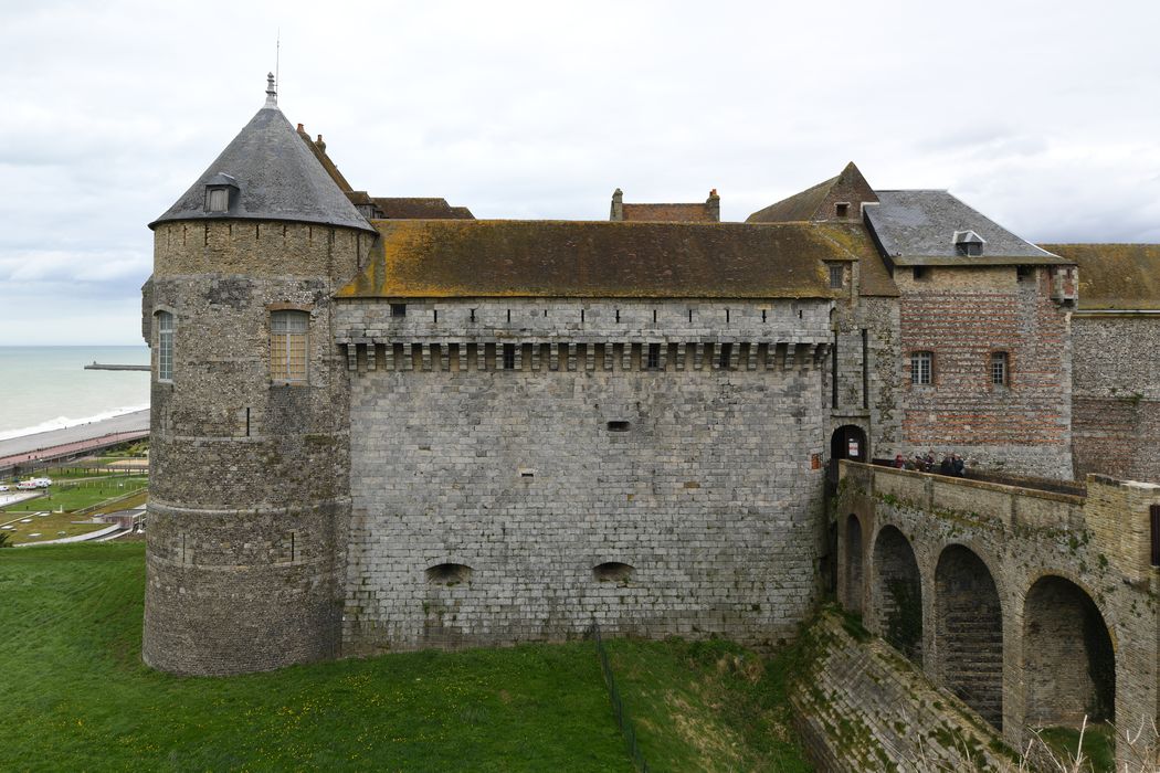 Corps de logis du front Nord flanqué de deux tours rondes ; aile à la suite sur la face ouest couronnée par des machicoulis, poterne contiguë et bâtiments crénelés jusqu'à la petite échauguette du 17e siècle ; tour Saint-Rémy ; logis avec sa tour, sis à l'est, dominant la plage et se reliant au bâtiment principal du front nord : classement par liste de 1862. Ensemble du système défensif du château, assiette foncière, y compris les vestiges enfouis (à l'exclusion de l'extension du musée) , soit la parcelle BR 58 (cad. BR 56, 58 ; AE 56) : classement par arrêté du 10 mai 1995