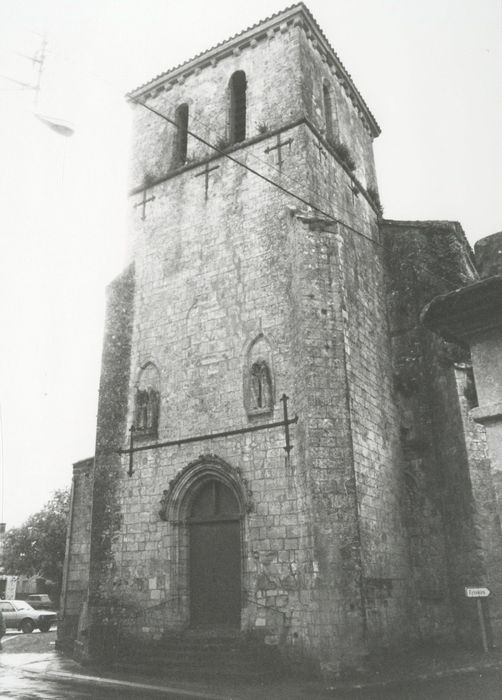 Des traces de l'édifice du 12e siècle subsistent dans la structure du mur sud. Des réemplois de pierres sculptées datant de la première époque de construction, sont visibles dans le mur du porche. Derrière le clocher-porche datant de la fin du 14e siècle, se distingue le départ de l'archivolte du portail primitif. Témoins du 12e siècle également, deux groupes de statues placés au-dessus du portail d'entrée, représentant les scènes de l'Annonciation et de la Visitation. Vers la fin du 14e siècle, cette église fut remaniée. De cette époque datent le clocher-porche, les piles et départs des voûtes de la nef ainsi que l'ajout d'un bas-côté à la construction primitive. La voûte est aujourd'hui remplacée par un plafonnement en bois. L'édifice présente un plan rectangulaire, terminé par un chevet à trois pans, cantonnés entre des contreforts en éventail. Au devant, le clocher-porche carré et massif est augmenté d'une tour sur le côté nord. L'église fut agrandie d'un bas-côté à gauche de la nef, qui s'inscrit dans un renforcement de la façade nord. Le portail d'entrée, de style gothique, est entouré d'une archivolte en arc brisé. A l'intérieur, le clocher-porche est aménagé en tribune.