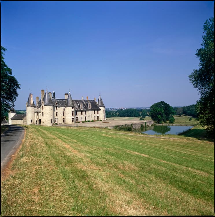 Construit au 12e siècle, le château est incendié en 1417 lors de la guerre civile entre Armagnacs et Bourguignons. Il fut reconstruit à partir de 1544. L'édifice comporte trois corps de bâtiments, flanqués de tours rondes qui s'ordonnent autour d'une cour fermée. A l'est et au sud se trouvent le corps de logis des 15e et 16e siècles ainsi que le pavillon d'entrée fortifié du 15e siècle et sa poterne. Au nord et au sud sont situées les deux ailes de communs, construites au 17e siècle à l'emplacement des anciens murs de fortifications dont il ne reste que deux tours. L'ensemble était entouré de douves dont il ne reste qu'une pièce d'eau en avant de l'esplanade est. L'intérieur conserve des cheminées des 15e et 18e siècles, ainsi qu'un décor stuqué dans le grand salon 18e. La tour d'angle intérieure du pavillon d'entrée conserve un escalier en vis du 15e siècle. Un parc paysager à l'anglaise s'étend vers le nord et l'est.