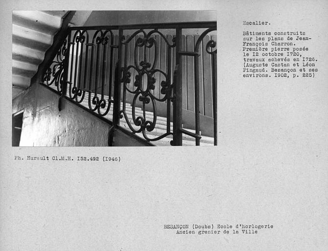 Facade et toiture de l'école d'Horlogerie (sur la place de la Révolution) au 27 rue des Boucheries : inscription par arrêté du 28 juin 1929 ; Façade et toiture, ainsi que la chaussée et le quai (quai Vauban) : inscription par arrêté du 16 septembre 1933 ; Les parties suivantes de l’enceinte urbaine : les vestiges enfouis de la contrescarpe de la tour bastionnée de Rivotte situés sur la parcelle 58 (section DK), les vestiges du rempart, même ceux enfouis, entre la tour bastionnée de la Rivotte et la tour bastionnée de Brégille, situés sur la parcelle n°11 (section AK), la partie du rempart entre le bastion du moulin Saint-Paul et les vestiges de la tour bastionnée Saint-Pierre, située 22 avenur Arthur-Gaulard, sur les parcelles n°16 et 67 (section AH), les vestiges de la tour bastionnée Saint-Pierre située rue Elisée Cusenier, sur la parcelle n°29 (section AE), les vestiges enfouis de la lunette de Bregille, situé sur la parcelle n°109 (section CX), le corps de garde est de Chamars du XVIIIe siècle, situé 2 avenue de la Gare d’Eau, sur la parcelle n°36 (section AR), l’ensemble des vestiges enfouis de la seconde ligne de remparts situés sous l’hôpital Saint-Jacques, sur la parcelle n°5 (section AV), 2 avenue de la Gare d’eau, parking du Département Doubs, 4 et 6 avenue de la Gare d’eau, sur les parcelles n°35, 44, 48 et 73 (section AR), le corps de garde nors de la porte d’Arènes, situé sur la parcelle n°164 (section AX), tels que délimités en rouge sur le plan annexé à l’arrêté : inscription par arrêté du 10 septembre 2019