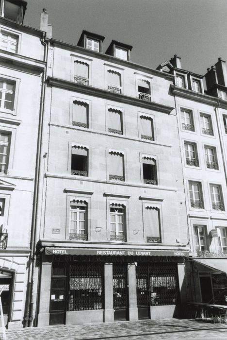 La devanture présentait une série de sept arcatures égales en plein cintre que les quatre pilastres corinthiens organisaient en une composition 1 - 3 - 1. Datable du troisième quart du 19e siècle, elle avait été modernisée probablement après la guerre de 1914 - 1918 : huisserie des baies, vantail art déco de la porte de l'hôtel à gauche.