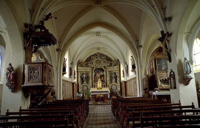 L'église Saint-Nicolas, d'origine romane, a connu une campagne de reconstruction - restructuration dans le derniers tiers du 15e siècle (adoption de la voûte d'ogives). Au 18e siècle, l'éclairage du choeur a été mis au goût du jour et l'église a été dotée d'un mobilier en bois de qualité. Le 19e siècle a apporté les reliques de Sainte-Victoire. Entourée de son cimetière, l'église orientée est de plan allongé. Précédée d'un porche octogonal (voûte à huit voûtains et clé pendante) et d'un vestibule, la nef de trois travées est accompagnée de chapelles latérales formant bas-côtés. Le choeur de deux travées se termine par un chevet plat ; il présente un retable de A. Fauconnier.