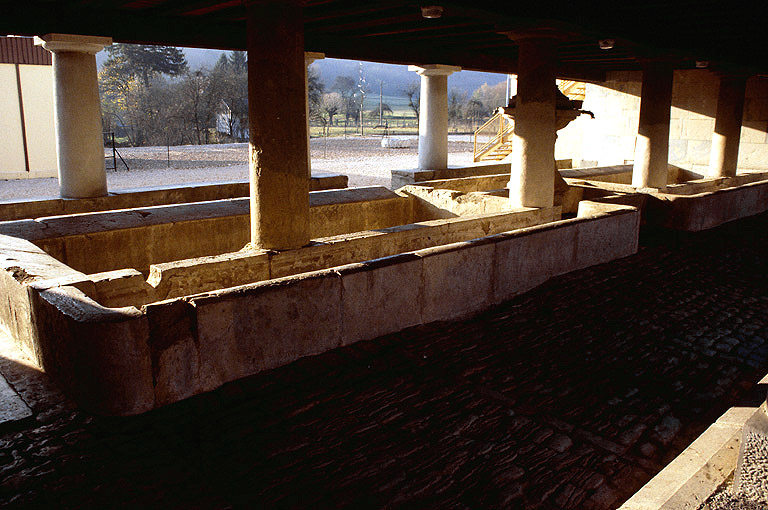 Façades et toitures ; fontaine-abreuvoir-lavoir au rez-de-chaussée, y compris les sols, murs, colonnes et plafond (cad. D 332) : inscription par arrêté du 31 juillet 1990