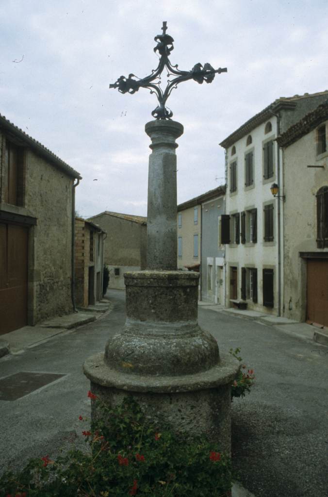 La croix a été dressée à l'emplacement des anciens fossés de la ville et date sans doute du début du 17e siècle. L'armature de la croix est constituée par quatre fers carrés cintrés en quart de cercle et tangents aux extrémités des bras. Le dessin de ces arcs de cercle est souligné, à l'extérieur et à l'intérieur, par des motifs redentés en fer plat. Dans l'évidement intérieur de la croix, ces petits fers dessinent un quatre-feuilles aux folioles lancéolées. A l'extérieur, ils forment quatre redents. Les extrémités des bras sont ornées de feuillages. Chacun de ces ornements comprend deux groupes de quatre pétales en feuillard. Le premier groupe, à l'extrémité du bras, a ses pétales retournés vers la pointe. Le groupe intérieur, qui simule les sépales, a les pointes repliées vers le centre de la croix. Sauf à la base, la décoration était complétée par des fleurons d'extrémités. Il n'a été employé dans ce travail ni rivets, ni vis, ni goupilles. Les éléments qui ne sont pas venus de forge ont été assemblés à la "chaude-suante".
