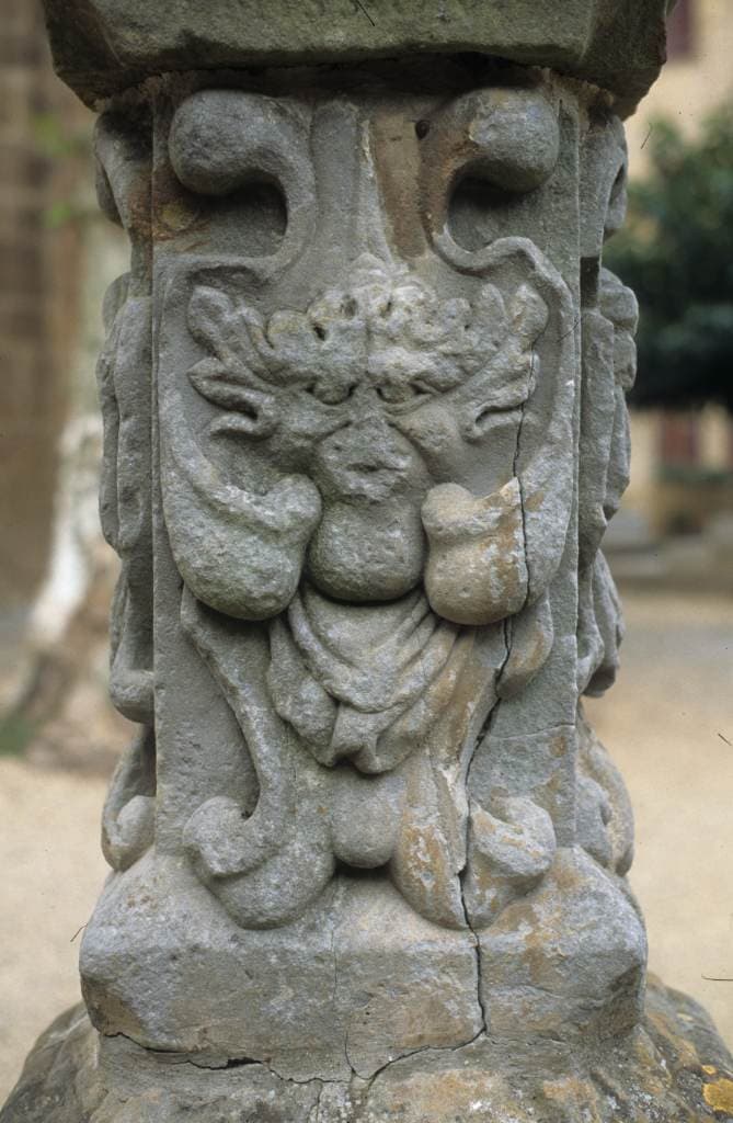 La croix est récente. La partie médiane du socle était constituée par une pierre de remploi sculptée, en grès, de provenance inconnue. Les quatre faces du pilier sont sculptées d'une tête ou d'un masque qui forme le centre d'un cartouche au découpage compliqué dont les bords se retournent en épaisses volutes. Le tout est lourdement chargé d'ornements baroques, de linges, de cordelières, toujours disposés suivant une rigide symétrie axiale.