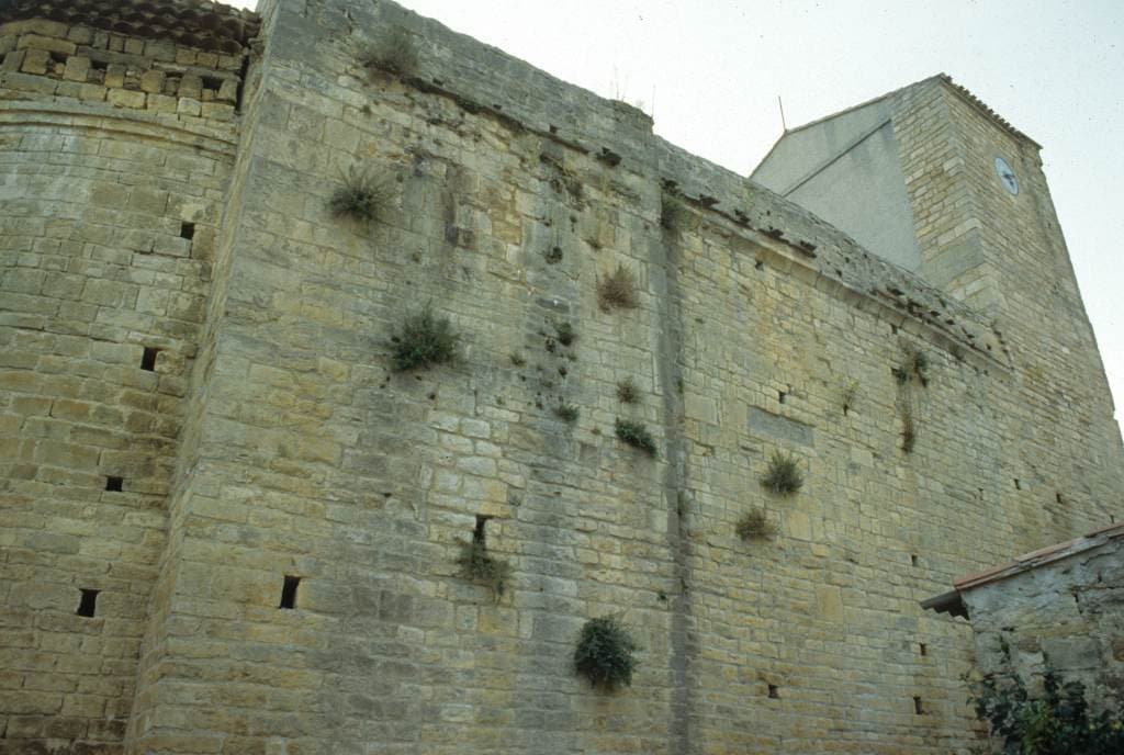 Eglise romane fortifiée qui servit de lieu de repli aux habitants pendant les guerres de Religion. C'est une église du 12e siècle, avec nef voûtée en berceau, abside demi-circulaire voûtée en cul de four et embryons de transepts constitués à l'extérieur par deux décrochements présentant à l'intérieur deux petites absidioles. L'édifice a probablement été fortifiée au 14e siècle. La courtine a été élevée sur la couverture en lauzes à l'aplomb extérieur du mur. Elle fut ensuite dérasée au niveau voulu pour l'établissement de la couverture actuelle en tuiles creuses. Au sud, la porte d'entrée comporte un gros linteau et un tympan. Le clocher devait être à l'origine un simple pignon à arcature, à l'ouest. Sans doute au 14e siècle, d'apèrs l'appareil, un clocher fut élevé sur ce pignon et sur les murs gouttereaux de la nef correspondant à la dernière travée. Ce clocher a dû être endommagé par l'incendie d'une grange qui était accolée à l'église, au moment des guerres de Religion, en 1580.