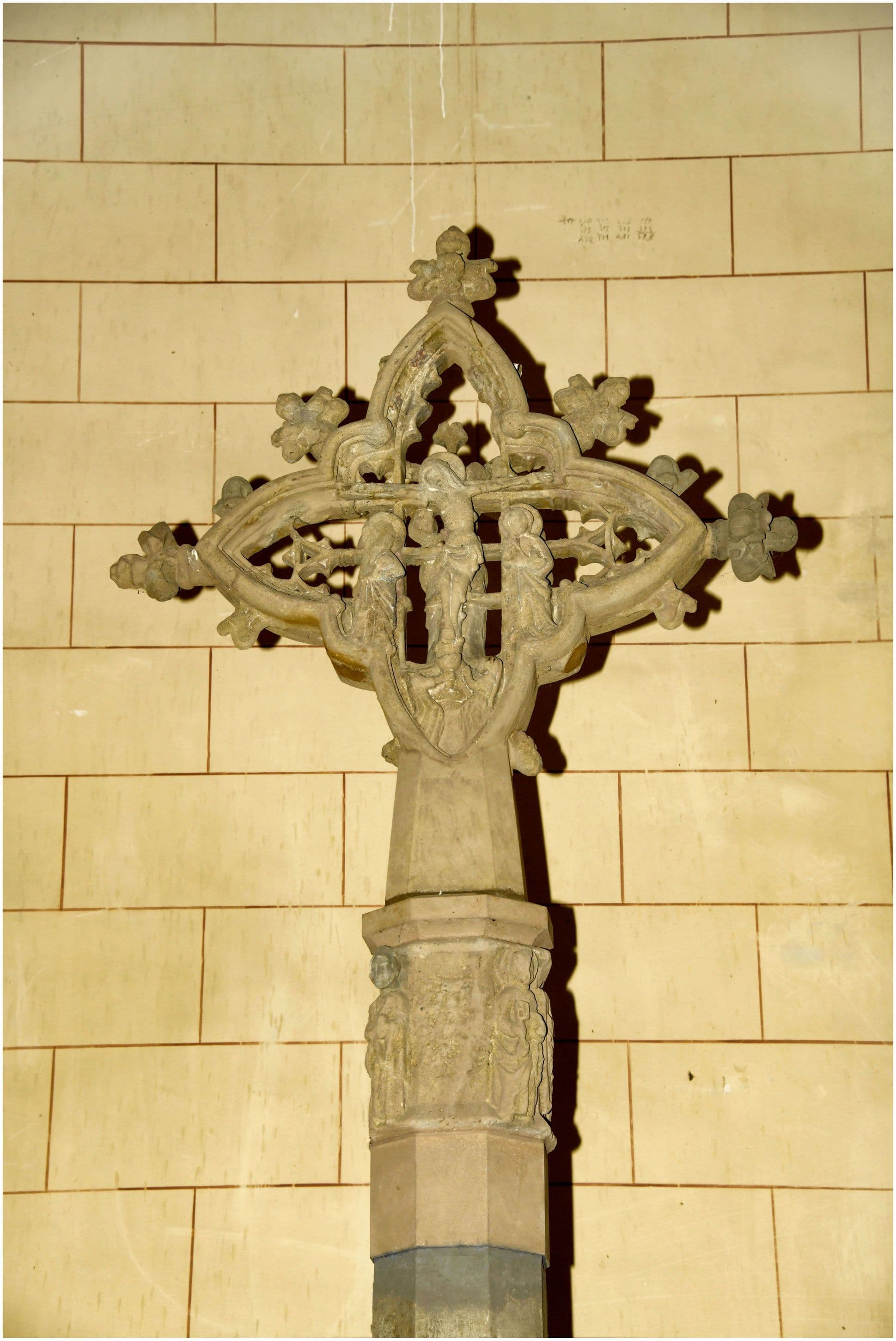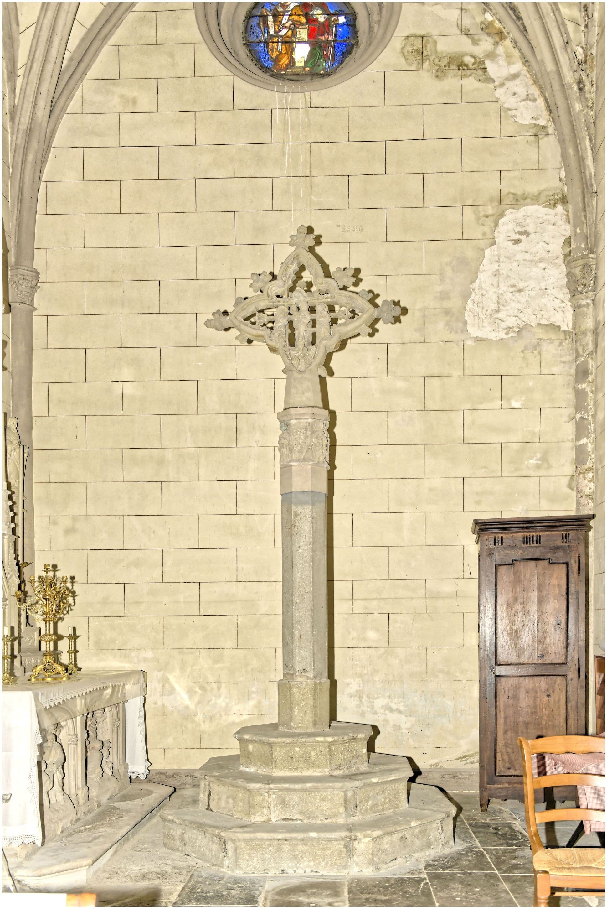 Croix de chemin placée, vers 1855, à côté du pont, à l'entrée du village. Elle se trouvait autrefois de l'autre côté de la rivière, sous un dais supporté par quatre piliers. Elle est en grès. Le fût a partiellement été refait au 19e siècle. Sur une face est sculpté le Christ entouré de sa mère et de sainte Madeleine. Sur l'autre face est représentée la Vierge couronnée par des anges entre un évêque mitré et un saint. Sur la bague sont sculptés saint Pierre, saint Paul, saint André et saint Sernin.
