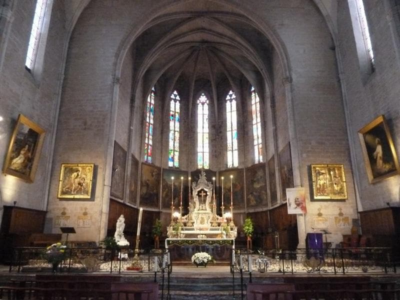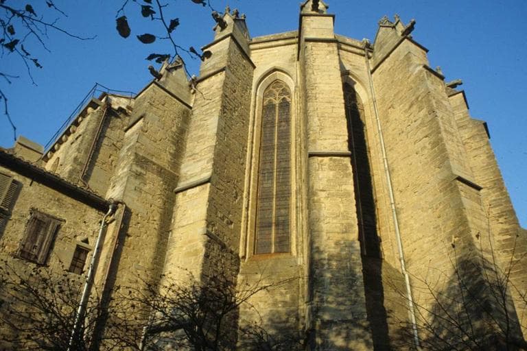 Eglise postérieure au dernier incendie ayant détruit la ville, déclenché par le prince Noir. Elle fut reconstruite à la fin du 14e siècle suivant la formule habituelle à ces régions : une nef avec charpente apparente portée par les arcs doubleaux et un choeur profond seul voûté. La nef possède des chapelles entre ses contreforts. La porte principale semble avoir été établie dès l'origine au nord à cause de la déclivité du terrain côté sud. Les colonnettes du choeur et les colonnes engagées des archivoltes ouvrant sur les chapelles, ont des chapiteaux à feuillages. A la suite des guerres de Religion, il semble que l'édifice eut à souffrir d'un long abandon. Le clocher était en ruine ainsi que les charpentes. De gros travaux furent entrepris plus tard. Des voûtes furent substituées à la charpente apparente. A la première travée touchant le choeur, on a essayé de rappeler la voûte gothique avec ses diagonaux puis le parti plus simple d'un berceau avec pénétration à la base a été adopté. Ces voûtes sont faites d'une série de cadres en bois, hourdés plein et recouverts d'un lattis et d'un enduit. Les derniers étages du clocher furent également reconstruits. Au 19e siècle, le style néo-gothique fut mis à l'honneur : ajout à la toiture d'une crête en terre cuite vernissée jaune et de lucarnes ; allongement des étroites fenêtres au nord ; ajout de roses aux chapelles du même côté ; création d'une porte dans la première travée vers l'ouest ; à l'intérieur, la base des piles engagées a été coupée pour recevoir un chemin de croix et une tribune a été construite dans le style du 13e siècle.