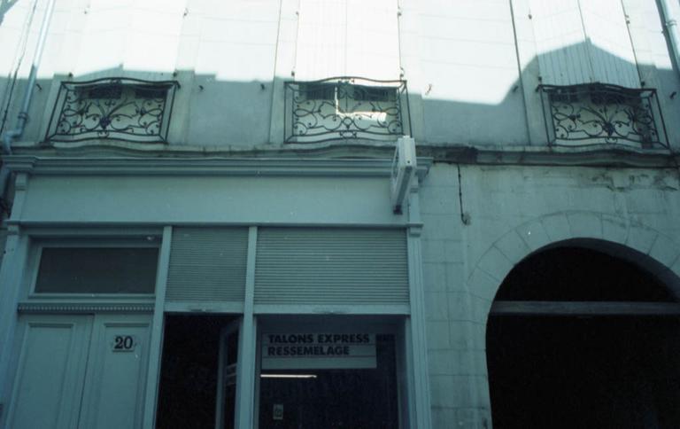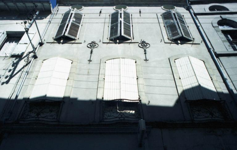 Maison à deux étages sur rez-de-chaussée. Les trois fenêtres présentent des balcons de type Louis XV, caractérisé par un fleuron central, symétriquement encadré par des volutes. Le cadre du panneau est double, entretoisé aux angles par de petits fers diagonaux, au milieu par un ovale spiralé. L'axe horizontal de symétrie est marqué latéralement par deux longues boucles opposées. Le motif central est une fleur, ou une feuille, trilobée, les deux pétales latéraux redentés, le pétale central constitué par deux volutes opposées, liées par l'intermédiaire d'une tige ronde zigzaguée.