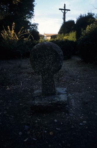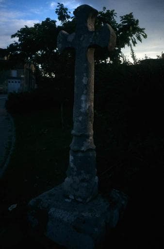 Monolithe de 1,50m de hauteur, implanté dans un socle cylindrique. Le fût, à pans coupés, est à section octogonale presque régulière. Les évidements qui séparent les bras de la croix sont en forme de lancettes. Dans un quatrefeuilles est sculpté en réserve un agneau pascal passant à senestre, soutenant de son pied droit relevé en arrière, une croix hastée et oriflammée. Les parties vues de la hampe, en-dessous et en-dessus du corps de l'agneau, ne sont pas exactement en prolongement. Cette disposition serait une indication, dans la région, de la fin du 13e siècle.