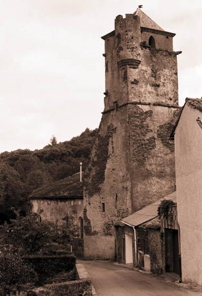 Les origines de l'église se rattachent à une cella fondée au début du 9e siècle, mentionnée en 828 et 950. L'église est mentionnée en 1249. Elle présente une nef unique, de même largeur que le chevet pentagonal. Chapelles latérales entre les contreforts. Clocher fortifié à l'ouest, enjambant une ruelle. C'est une tour carrée à deux étages, plus un étage modernisé. L'élément le plus intéressant en est la petite échauguette de l'angle nord-ouest. Cette guérite est supportée par une série de quatre encorbellements circulaires superposés. Le portail est en arc brisé, avec archivolte composée de trois boudins et de trois gorges. Les boudins en amande très effilés indiquent un style de la fin du 14e siècle.