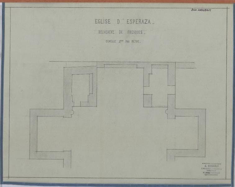 L'édifice, ravagé par les guerres de Religion, a été entièrement rebâti au 17e siècle. Quelques murs ont été conservés de l'édifice précédent. Le chevet devait comporter une abside flanquée de deux absidioles. Les maçonneries anciennes conservées sont toutes situées au chevet. Des peintures ont été retrouvées, sur la paroi d'une chapelle latérale, dans une embrasure qui devait être une entrée d'abside. La peinture découverte présente un soubassement décoré de personnages groupés en scènes et qui semblait occuper une large partie du mur jusqu'à un niveau un peu inférieur à celui des naissances des arcs. Les scènes sont limitées, vers le haut, par deux galons, l'un orné de petits cercles, l'autre à fond blanc portant des inscriptions. Au-dessus des galons se trouve un élément de large bordure à motif de feuillages. Les arcs sont décorés de deux larges bandes. La première, placée en archivolte, représente un galon plié en chevrons, encadré de petites perles. La seconde est formée, sur un fond de petites perles régulièrement disposées, d'une série de cinq médaillons encadrés de galons et de perles, où sont représentés des figures. Il pourrait s'agir d'un décor du 12e siècle.