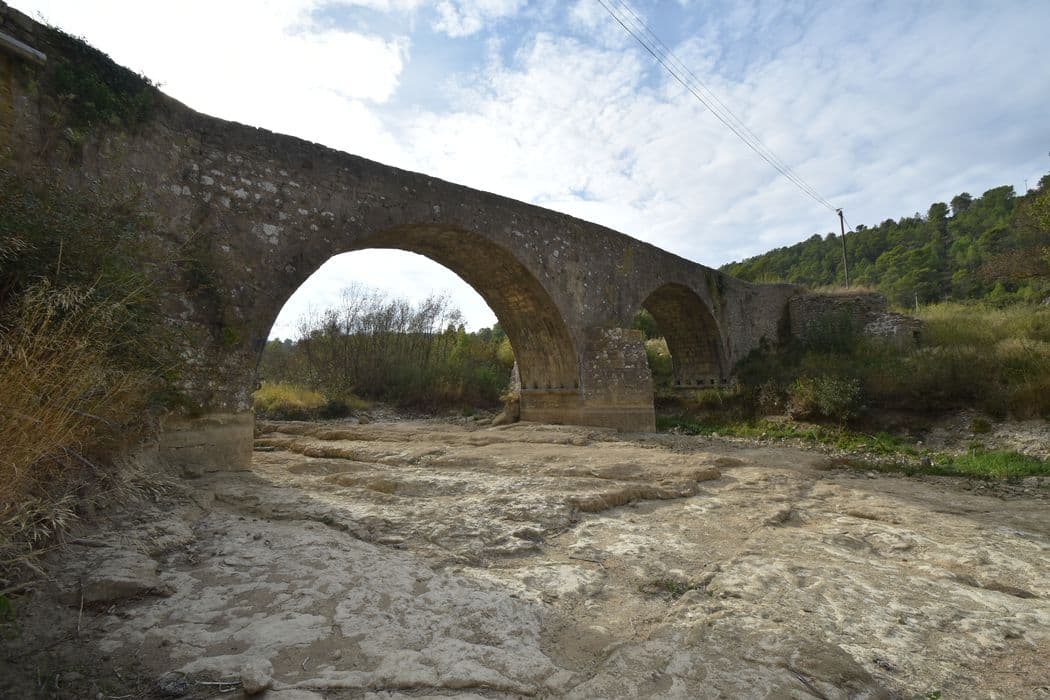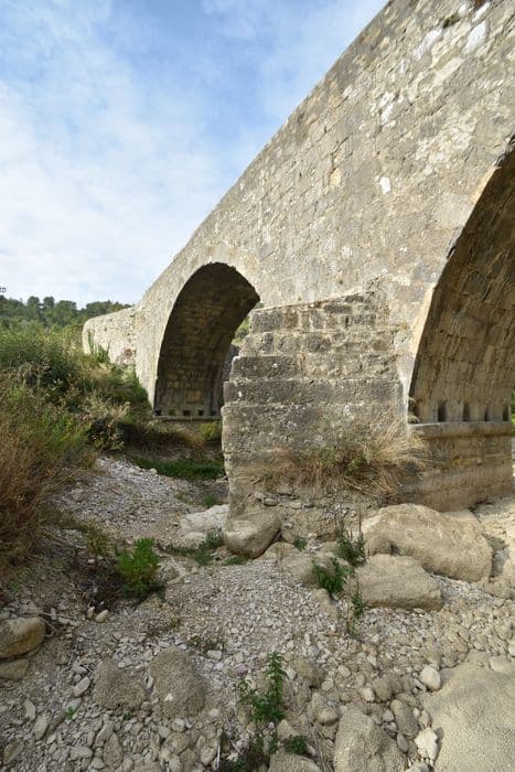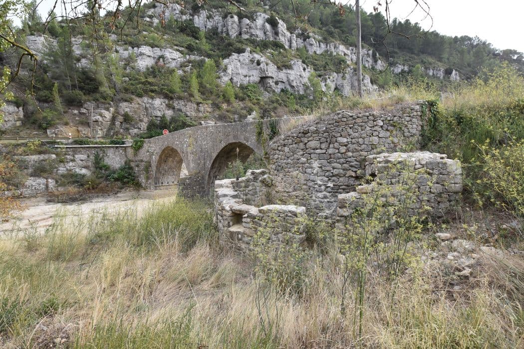 La première mention certaine du pont date de 1759. L'ancien chemin de Lagrasse à Carcassonne franchissait ce pont après avoir traversé les pentes de la montagne de la Coque. Pour éviter ce parcours accidenté, une nouvelle route a été ouverte à la fin du 19e siècle, dans les gorges de l'Alsou, laissant au nord l'ancien tracé et le pont. L'ouvrage est à deux arches. Pile à avant-becs à assises en retraites. Voûtes en plein cintre entièrement appareillée. De part et d'autre de chaque culée, des murs en aile, bas, maintiennent le déblai. Accolée à la culée nord, côté aval, existe une construction cylindrique dont l'accès se fait par un étroit passage couvert. Ce dernier est recouvert par une coupole en blocage, creusée en son sommet d'une ouverture carrée encadrée par quatre blocs.