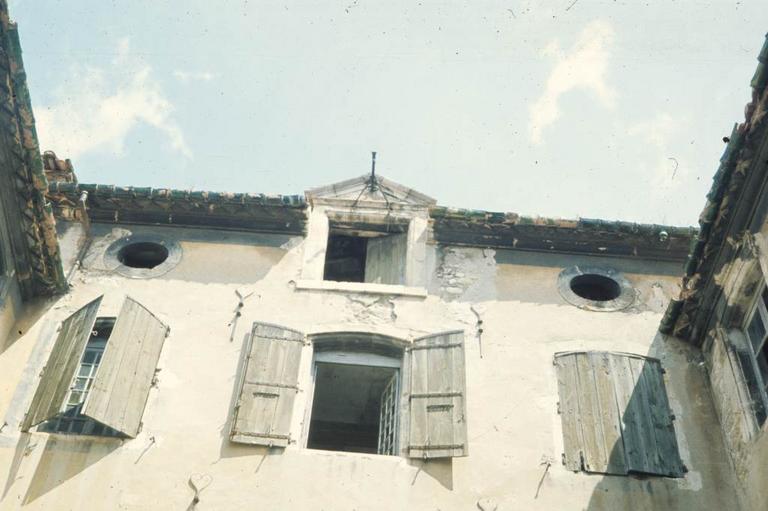 Dans la façade sur la rue s'ouvre, sous un arc en anse de panier, le portail d'entrée qui donne directement accès à la cour d'honneur au fond de laquelle se trouve un passage en anse de panier. Ce passage donnait autrefois accès au parterre, orné en son centre d'un grand bassin cruciforme. Cette partie ayant été vendue et bâtie, le passage a été muré. A gauche, un arc de moindre ouverture, également en anse de panier, donne accès à un escalier à deux volées qui dessert les étages. La façade nord de la cour présente encore trois arcs analogues, jadis les entrées des remises. A droite, l'aile sud du bâtiment contient le grand escalier qui ne dessert que le premier étage. C'est un escalier à trois volées droites, sur plan presque carré. Les limons sont portés par des arcs rampants ornés de moulures.