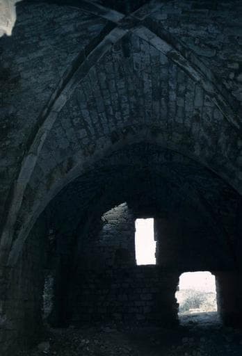 En 1093, installation de religieux dans la forêt de Fontfroide. Contraints par la règle à réinvestir leurs revenus, les religieux se lancent, dès les années 1140, dans des achats très importants de terres. D'après la règle cistercienne, les moines doivent cultiver leurs terres eux-mêmes. Ne pouvant le faire de Perpignan à Béziers, l'abbaye va mettre en place le système des granges, au centre d'un groupe d'exploitations, cultivées par les convers. La grange est le type même de l'exploitation cistercienne organisée comme un petit monastère, sous l'autorité d'un "magister grangial" dirigeant les travaux agricoles des frères convers. A la fin du 13e siècle, l'existence d'au moins 24 granges est attestée pour l'abbaye de Fontfroide, dont celle de Fontcalvy. L'édifice est de plan carré, à un étage sur rez-de-chaussée. Ce dernier était constitué, à l'origine, d'une seule et vaste salle, divisée plus tard en salles plus petites par des murs séparatifs dont l'un d'eux subsiste encore. Cette salle est couverte de quatre voûtes sur croisées d'ogives séparées entre elles par des arcs doubleaux. Arcs doubleaux et diagonaux prennent appui au centre sur un imposant pilier fasciculé dont le profil est engendré par la rencontre des différents arcs. L'entrée est placée à l'est, à la base d'une tour de section carrée, volontairement désaxée par rapport à la façade en raison de la retombée d'un arc doubleau et de deux arcs diagonaux dans l'axe médian. L'entrée constitue une sorte de sas entre deux portes en plein cintre, au-dessus duquel un plancher ajouré pouvait faire office d'assommoir. Un plancher divisait, dès l'origine, la vaste salle du rez-de-chaussée en deux niveaux. L'accès à l'étage est assuré par une rampe extérieure adossée à la façade est. Cette disposition, qui ne tient pas compte du système défensif, n'est pas d'origine. Une trappe munie de marches et ménagée dans la voûte au revers de la façade est, semble avoir été l'accès primitif, probablement assuré par une échelle légère. Il y a tout lieu de penser qu'un second système à échelles mobiles devait exister dans la tour est. L'édifice était couvert d'un toit à deux versants dont l'arête supérieure était portée par deux arcs diaphragmes brisés. A l'extérieur, le contrefort médian de la façade sud est évidé à partir d'une certaine hauteur jusqu'à l'étage supérieur, formant ainsi une sorte de gaine dont l'usage est encore mal défini. Au devant de la façade est et dans sa partie supérieure, deux arcs appareillés prennent appui sur les contreforts d'angles et sur la tour centrale. Il est probable que ces arcs supportaient à l'origine une courtine qui ceinturait l'édifice comme paraissent l'indiquer les corbeaux en saillie. Faisant partie du système défensif, les quatre contreforts d'angle étaient aménagés en guettes. Leur partie supérieure correspond à une logette, protégés par un garde-fou, et à laquelle on accède depuis l'étage par un étroit passage.
