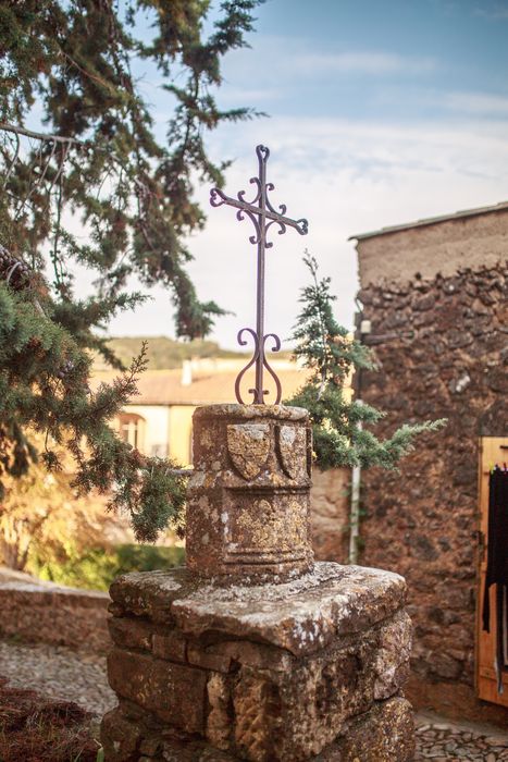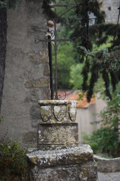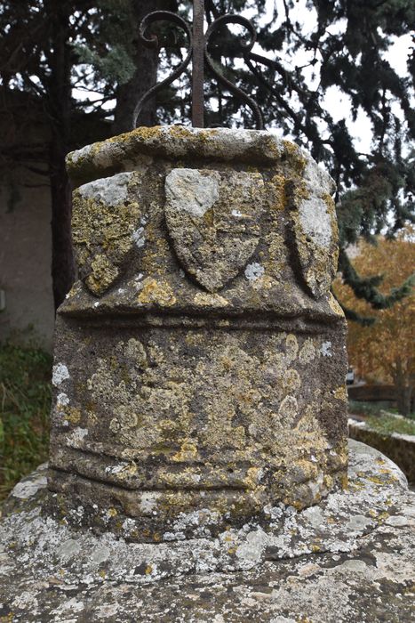 Le piédestal de la croix est orné de trois blasons. Le blason central présente les armes de Pierre de la Jugie, archevêque de Narbonne (1347-1375), seigneur direct de Villerouge-Termenès. Les blasons qui encadrent celui-ci de chaque côté, portent une croix un peu ornemanée et au coeur de laquelle est un roc d'échiquier. La croix peut rappeler le chapitre de Saint-Just dont dépendait l'église de Villerouge. Sa forme particulière est une brisure des armes du chapitre et le roc d'échiquier rappellerait que Villerouge était le chef-lieu de l'archiprêtré du Termenès ou des Corbières.
