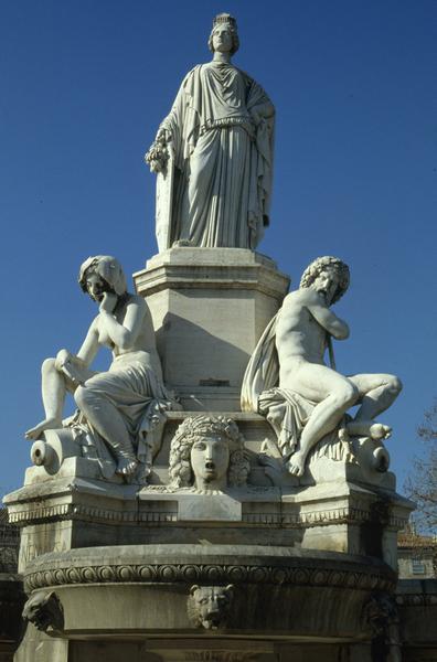 En 1840, l'arrivée du chemin de fer à Nîmes incite la municipalité à créer un monument artistique digne d'une nouvelle entrée triomphale dans le centre de la ville et à proximité du palais de justice néo-classique. Le concours lancé en 1844 pour une fontaine monumentale est remporté par Charles Questel pour le dessin. Elle sera réalisée par Pradier qui appartient à une famille protestante locale. Elle sera inaugurée en 1851. La fontaine symbolise Nîmes et les quatre sources d'approvisionnement : fontaine Nemosa, fontaine de l'Eure à Lezès, Gardon et Rhône. Les cinq figures sont réalisées en marbre blanc.