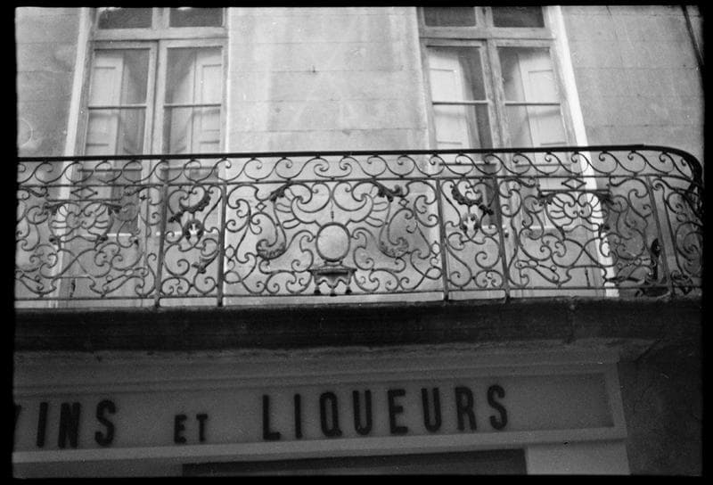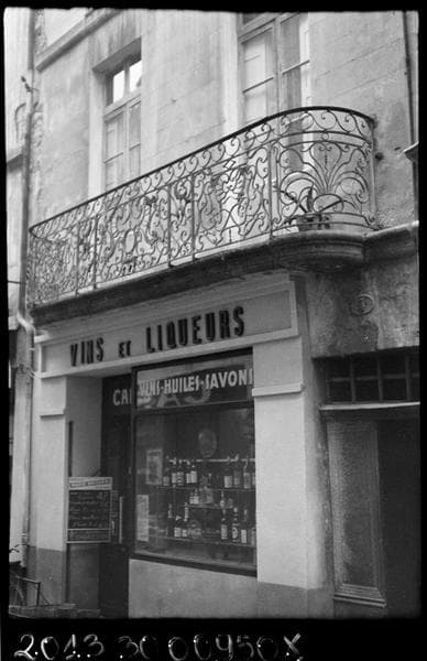 Cette maison paraît avoir appartenu au chapitre cathédral et, à ce titre, aurait peut-être été incluse dans les grandes répartitions faites en 1772, aux immeubles de la Grande-Rue dépendant du Chapitre. Au-dessus d'une devanture de boutique, occupant tout le rez-de-chaussée, chacun des étages est éclairé par deux baies. Au premier étage, ce sont des portes-fenêtres desservies par un grand balcon commun. La partie antérieure, rectiligne, de cette ferronnerie, se compose de trois panneaux séparés par des pilastres, tous limités à la partie supérieure par un encadrement relié à la main-courante par une série de volutes. Le panneau central, un peu plus long que les autres, comporte un médaillon ovale, vide, souligné par une draperie de tôle à trois glands, et entouré par un grand fleuron. Les volutes du remplage sont de types variés. Les deux panneaux latéraux sont composés de la même façon, excepté que le médaillon central y est remplacé par deux volutes croisées en x. Les panneaux des retours, cintrés en quart de cercle, se distinguent des autres par leur double encadrement, cernant un grand fleuron qui constitue le remplage.