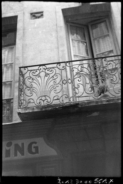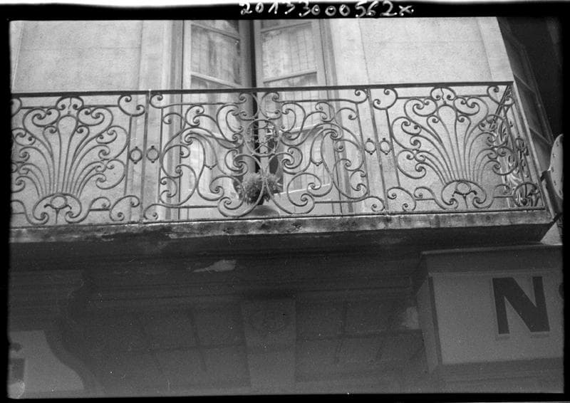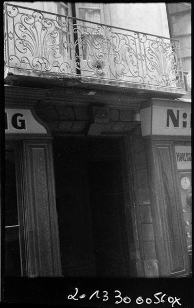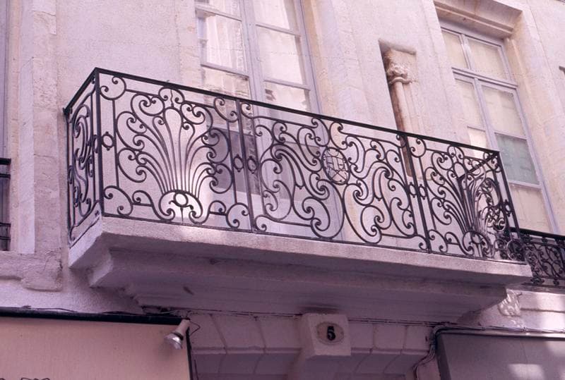 Les propriétaires de cet immeuble sont connus depuis 1671. D'après le style général de la façade et de la ferronnerie, la construction du balcon doit être postérieure à 1783. La façade est percée de quatre baies par étage, avec une porte d'entrée encadrée de deux boutiques en rez-de-chaussée. Le balcon du premier étage, au-dessus de la porte, est un balcon droit et se compose de trois panneaux, deux carrés encadrant un panneau central rectangulaire. Les panneaux des retours, seuls, sont à volutes dissymétriques. Les autres sont symétriques par rapport à l'axe vertical. Au panneau central, un médaillon ovale contient les lettres HH au-dessus de deux ancres entrecroisées. Il est soutenu par deux grands C accolés, et raccordé à de longues volutes ramifiées dont les longues ondulations convergent vers un oeil commun à deux ou trois de ces spirales. L'encadrement est double, avec demi-volutes dans les angles. Les fleurons des deux panneaux latéraux comportent une double couronne florale à sept pétales, celui de l'axe étant agrémenté d'une petite tige ondulée qui marque la symétrie. Entre les deux fenêtres de gauche, en haut du trumeau, se trouve une pierre incrustée, sculptée d'une colombe.