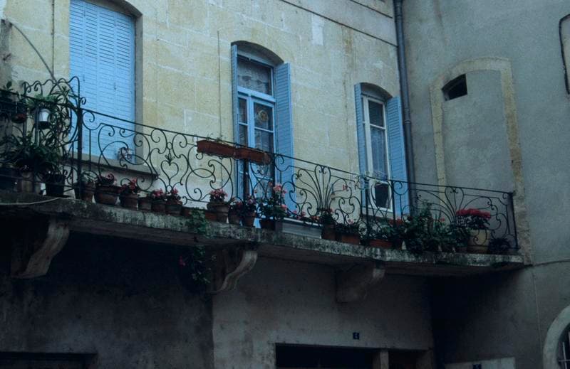 De fortes consoles de pierre soutiennent les dalles qui forment le sol du balcon. La balustrade est en fer forgé et se compose de cinq grands panneaux, séparés par quatre panneaux plus petits. Les panneaux se répètent deux par deux, de part et d'autre du motif central, plus grand et de dessin différent.