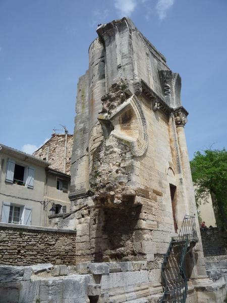 Le premier évêque de la commune, Agidius, devenu saint Gilles, était originaire d'Athènes. Il se fixa dans les environs de Nîmes au cours du 7e siècle et fonda un monastère qui fut le berceau de l'église. Les invasions arabes interrompirent cette construction et obligèrent Agidius à se réfugier à Orléans. A son retour, après la victoire de Charles Martel, le monastère était détruit. Après sa mort, l'église, où ses reliques avaient été déposées, devint le centre d'un nouveau monastère autour duquel une ville se forma. Le port de Saint-Gilles devint, à la fin du 11e siècle, le rendez-vous de tous les pèlerins se rendant en Terre Sainte. A cette époque, le monastère comptait trois églises dont l'une était sous l'invocation de saint Gilles. Ces édifices furent démolis et leurs matériaux utilisés pour bâtir une grande basilique dont les fondations furent posées en 1116. Choeur, transepts et portail appartiennent à la seconde moitié du 12e siècle. Les troubles causés par la guerre contre les Albigeois interrompirent la construction et l'église resta inachevée. Sécularisé vers le milieu du 16e siècle, le monastère souffrit des guerres de Religion durant lesquelles Catholiques et Protestants s'en disputèrent la possession. L'église, transformée en forteresse, soutint plusieurs sièges. En 1622, le duc de Rohan, général des églises réformées de Languedoc, ordonna sa démolition, mais l'ordre ne fut qu'en partie exécuté (fragment de l'ancien choeur conservé). La Révolution acheva la démolition. Il ne subsiste de l'édifice qu'une partie de l'église souterraine et le portail ouest. Trois portes le composent. Une frise à sujets bibliques réunit ces trois ouvertures. Les trumeaux qui séparent les deux portes latérales de la grande porte sont décorés par des niches garnies de statues représentant les apôtres. Le nom du sculpteur Brunus est gravé au fond de la niche qui abrite la statue de saint Jude. Des traces de peinture subsistaient encore sur les statues au 19e sècle. Des graffiti recouvrent deux colonnes de la façade (galère à voiles ; oiseaux ; tracés ; guerriers armés ; caractères illisibles ; peut-être une représentation de Saint-Louis coiffé d'une couronne à trois feuilles). Ces graffiti sont peut-être l'oeuvre de croisés venus à Saint-Gilles en 1270.