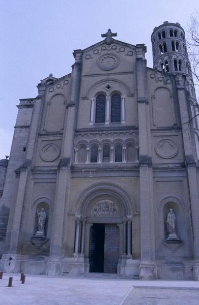 La cathédrale était pourvue d'un chapitre de l'ordre des chanoines réguliers de saint Augustin. En 1546, ce chapitre adopta la religion protestante puis revint, en 1633, au catholicisme. Il se soumit alors à la règle des chanoines réguliers de la Congrégation de France. La cathédrale, à l'exception de la tour Fenestrelle (12e siècle), fut à peu près détruite au cours des guerres de Religion. La reconstruction commença au 17e siècle. Le gros oeuvre fut commencé par le chevet, entièrement achevé en 1649. L'édifice fut ouvert au culte en 1660. Les contrats liés au mobilier et à la décoration intérieure furent établis entre 1678 et 1680. La façade occidentale néo-romane fut plaquée contre l'ancien mur-pignon à la fin du 19e siècle. L'édifice se compose d'une large nef centrale, bordée de chapelles latérales aménagées entre les contreforts et surmontées de tribunes, ces dernières étant interrompues au droit de la seconde travée à partir du sanctuaire pour former un transept. Le sanctuaire, dont la partie demi-circulaire est inscrite dans le plan rectangulaire de l'édifice, comporte une travée qui correspond à une chapelle latérale de part et d'autre. La partie 17e siècle se lie, à l'ouest, à des bâtiments préexistants et notamment à la tour Fenestrelle qui flanque l'angle sud-ouest. A l'ouest, l'ancien mur de fond a été incorporé dans la construction du nouveau clocher nord (campagne 1649).