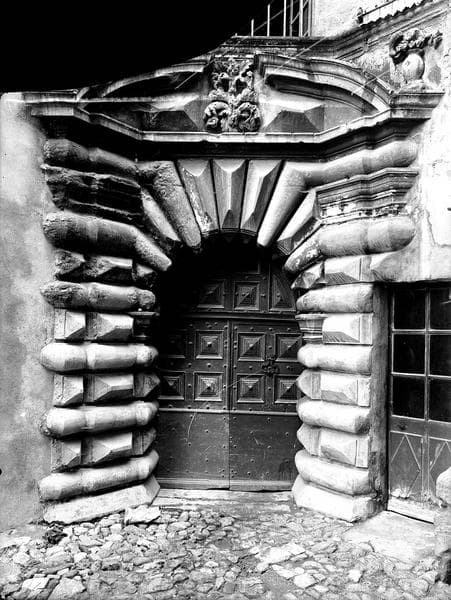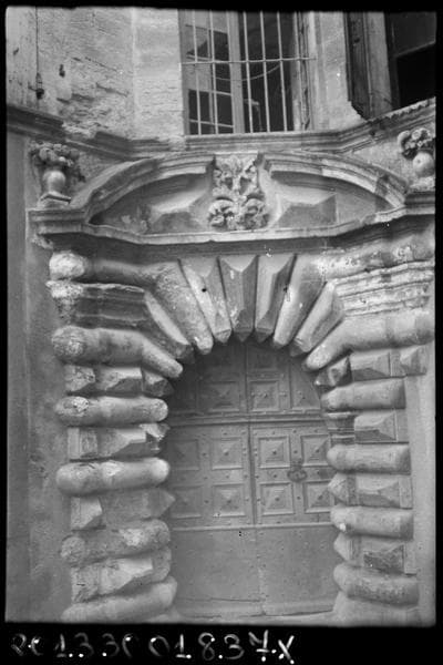 Portail de style Louis XIII, établi sur trois pans, les montants se prolongeant en parties obliques par rapport à la porte elle-même. L'appareil en bossage comporte des assises taillées alternativement en gros boudins et en pointes de diamant. De longs claveaux se prolongeant en retour d'équerre et dessinant à l'intrados des segments de cercle, ferment la baie. Un motif composé de feuilles découpées occupe le centre du fronton dont les extrémités sont amorties par deux vases. Les vantaux, de la même époque que le portail, sont ornés de grandes pointes de diamant taillées à même le bois.