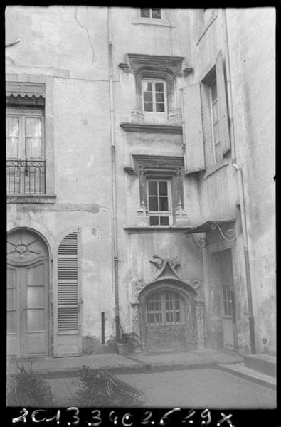 Une importante dénivellation sépare les rues des Docteurs-Bourguet et la rampe des Canterelles, entraînant au rez-de-chaussée de l'édifice la création d'une terrasse rue des Docteurs-Bourguet. L'immeuble ayant subi d'importantes modifications au 18e siècle, notamment dans les dispositions du portail d'entrée, il en est résulté des terrassements assez importants qui ont exhaussé le sol de la cour. La base de la tourelle d'escalier, en bordure de cette cour, s'est ainsi trouvée enterrée. Cette tourelle ainsi que les autres vestiges flambloyants encore visibles, sont situés au fond de la cour. L'ancienne porte sur cour de la tourelle est accostée de faisceaux de colonnettes formant pinacles, et surmontée d'un gâble à inflexions. Des animaux monstrueux de haute dimension en décorent les rampants (lion aîlé, chimère, basilic).