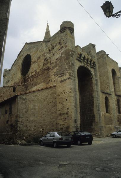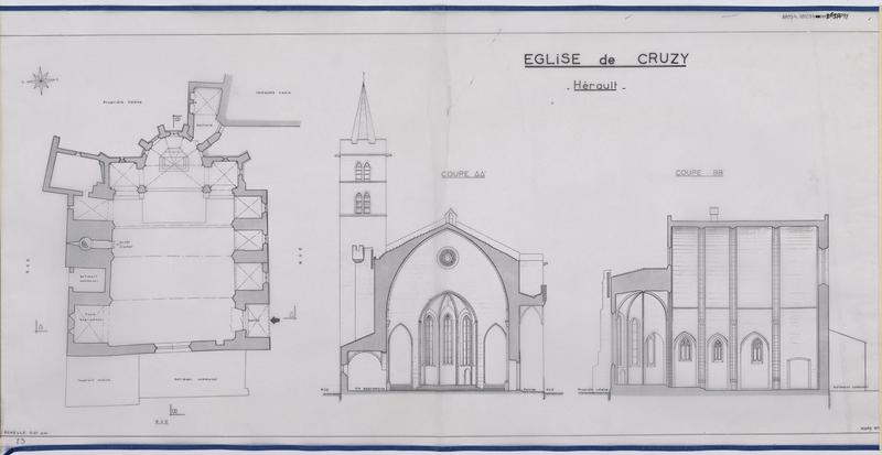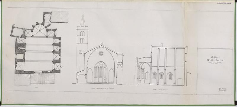 L'église présente une variante assez rare au type régional très répandu des églises du 14e siècle. Par la disposition du choeur et des deux absidioles, Cruzy rappelle les églises Saint-Michel et Saint-Vincent de Carcassonne. Tandis que ces églises sont couvertes d'une voûte ordinaire avec arcs diagonaux ou par une simple charpente, celle-ci est couverte par un grand berceau renforcé par les arcs doubleaux. Ce berceau a 18,60m de portée et indique une certaine audace chez son constructeur. Au premier abord, l'église semble avoir été bâtie d'un seul jet pour la nef et le choeur, mais les joints des colonnes prismatiques engagées dans les murs latéraux concordent rarement avec ceux de l'appareil de ces murs. On peut se demander si l'on n'est pas en présence d'un berceau roman renforcé de doubleaux au 14e siècle. Les trois chapelles du midi ont été agencées au 15e siècle entre les contreforts. La porte remonte à la même époque, ainsi que la défense supérieure à mâchicoulis qui forme porche. Les échauguettes posées en encorbellement aux angles de la façade ouest et sur tous les contreforts à la suite, datent du 14e siècle. Le clocher est plus tardif.