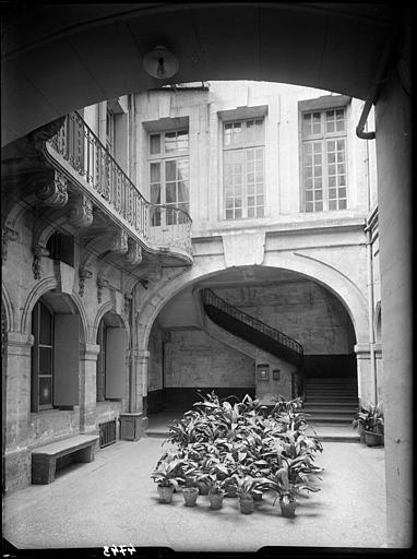 Façades sur rue et sur cour et toitures correspondantes ; escalier avec rampe en fer forgé ; galeries avec grilles en fer forgé (cad. L 1075) : inscription par arrêté du 1er juin 1965